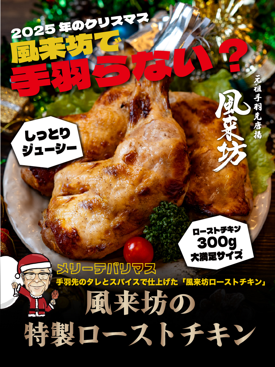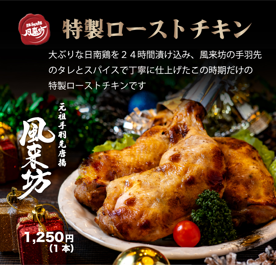 ■数量限定・特別なチャンス! 風来坊のクリスマス限定ローストチキン単品は、数量限定でのご用意です。この機会を逃すと手に入らなくなるかもしれません。特別な日をさらに特別にするため、ぜひお見逃しなく!