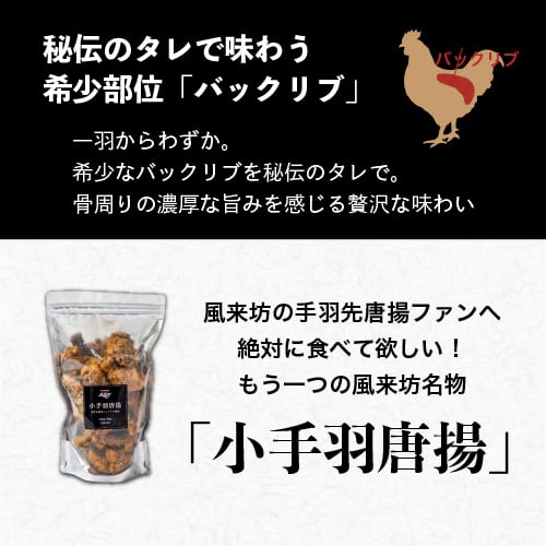 ■風来坊 小手羽唐揚 風来坊の小手羽唐揚は、鶏の希少部位のバックリブを使用し、カリッと揚げた一品です。特製のタレとスパイスが絶妙に絡まり、ジューシーな味わいが口の中で広がります。自宅で手軽に本場の風味を楽しめる、まさにうれしい逸品です!