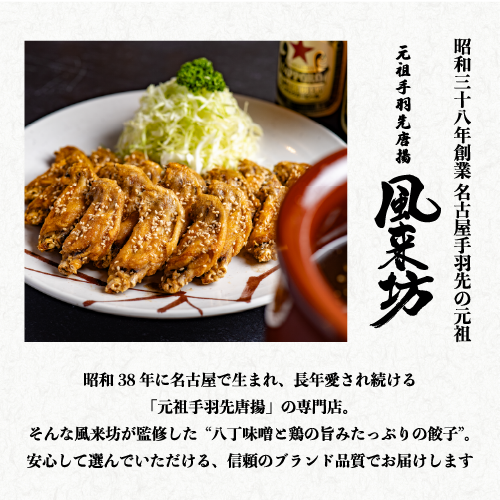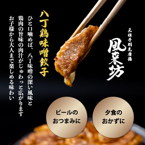 ■風来坊が誇る絶品餃子! 風来坊の八丁鶏味噌餃子は、厳選した八丁鶏と特製の味噌を贅沢に使用した、逸品です。ジューシーなお肉の旨みに、風味豊かな味噌がしっかりと絡み、一口頬張れば、食欲をそそる絶妙なハーモニーを楽しむことができます。創業以来変わらぬ品質をお届けし、皆様の食卓を彩ります!